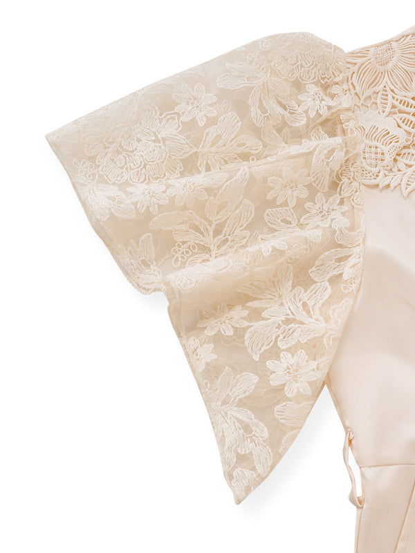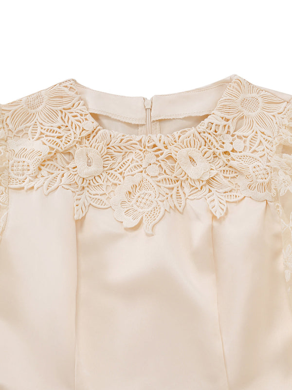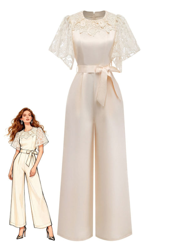 Aprikose 1950er Blumen Spitze Satin Bogen Gürtel Jumpsuit