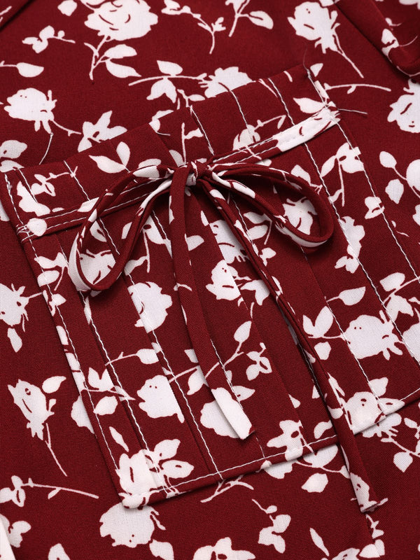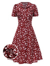Rot 1950er Revers Blümchen Kleid mit Knöpfen