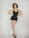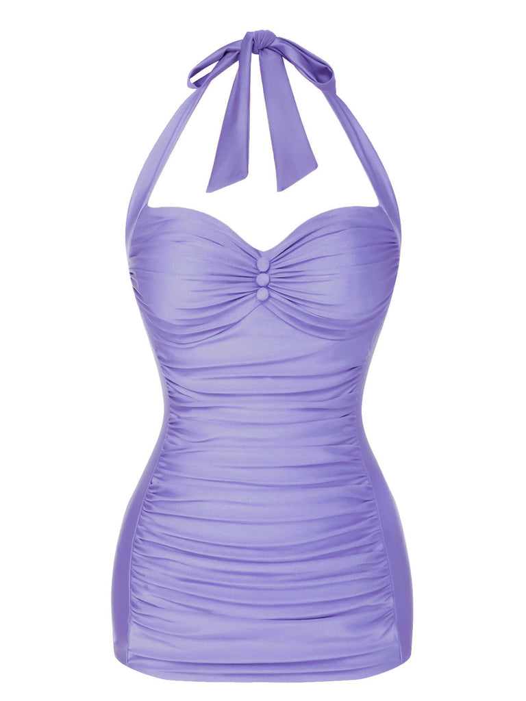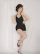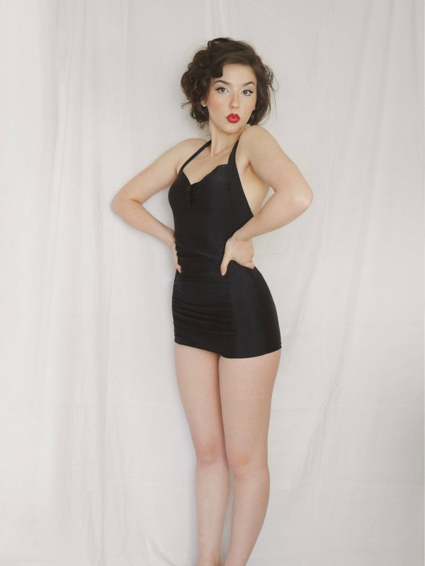 Schwarz 1950er Solide Halter Falten Badeanzug