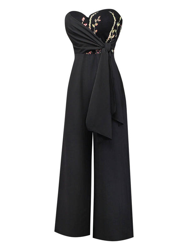 [Vorverkauf] Schwarz 1960er Besticktes Blumen Schnür Trägerlos Jumpsuit