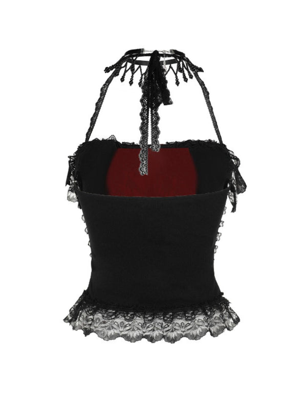 Schwarz 1980er Gothic Steampunk Halter Spitze Kreuz Camisole & Choker